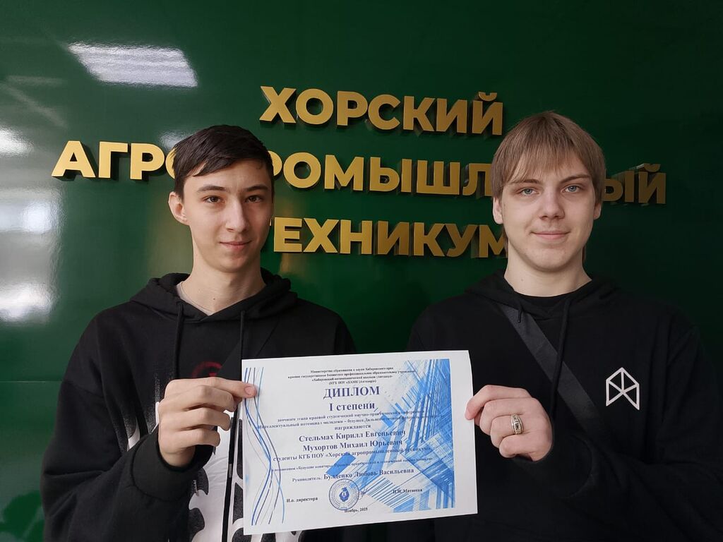 В с 1 по 14 ноября 2025 года, студенты группы ЭСХМ-427 Мухортов Михаил и Стельмах Кирилл, под руководством преподавателя Булденко Л.В. принимали участие в краевой студенческой научно - практической конференции "Интеллектуальный потенциал молодёжи - будущее Дальневосточного федерального округа", где представляли свою исследовательскую работу "Почвенный анализ сельскохозяйсвенных полей Хорского агропромышленного техникума".