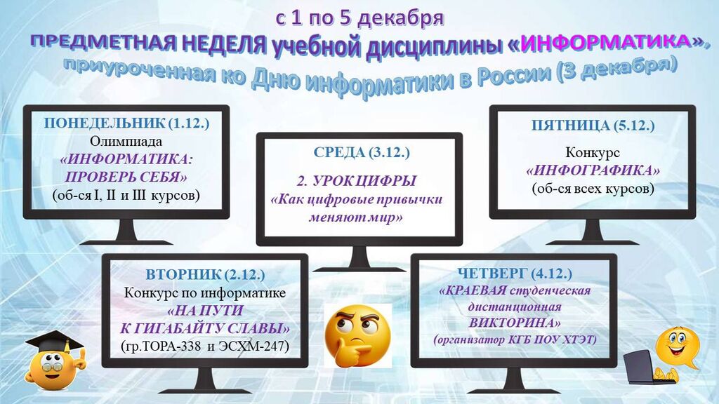 *В техникуме завершилась предметная неделя дисциплины «Информатика»** С 1 по 5 декабря в нашем техникуме прошла предметная неделя учебной дисциплины «Информатика», приуроченная ко Дню информатики в России, который отмечается 4 декабря.