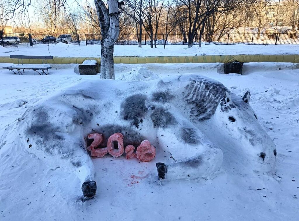 ✨ Возле нашего общежития появился настоящий зимний шедевр — красивый символ года «Лошадь», сделанный из снега своими руками ! ❄️🐴