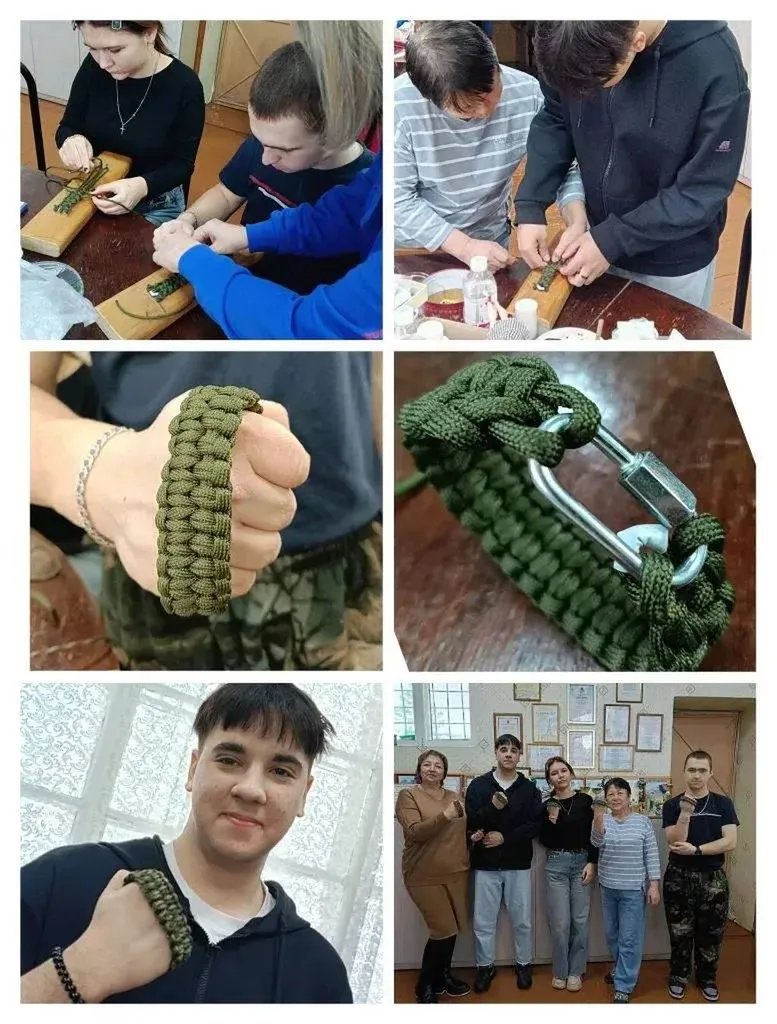 🌟 Плетём браслеты жизни для ребят СВО! 🌟 Вчера группа П-512 впервые попробовала сплести браслеты жизни для наших защитников. Работа оказалась кропотливой и достаточно сложной — первые попытки были неудачными, и браслеты не расплетались. Но благодаря помощи Аллы Петровны мы быстро разобрались с схемой плетения, и каждый смог сплести свой собственный браслет!