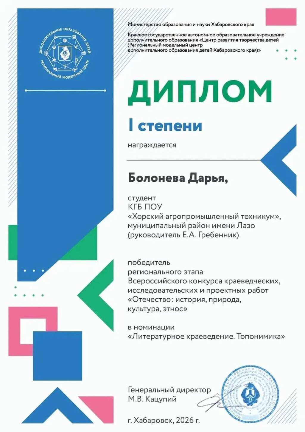 Краевое государственное автономное образовательное учреждение дополнительного образования «Центр развития творчества детей» (Региональный модельный центр дополнительного образования детей Хабаровского края) с гордостью объявляет о победе Дарьи Болоневой, студентки КГБ ПОУ «Хорский агропромышленный техникум» (муниципальный район имени Лазо), в региональном этапе Всероссийского конкурса краеведческих, исследовательских и проектных работ «Отечество: история, природа, культура, этнос».