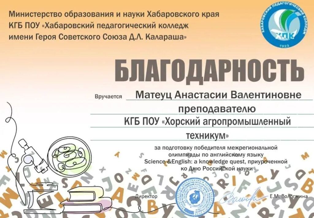 В феврале прошла межригиональная олимпиада по английскому языку Science and English: a knowledge quest, приуроченная ко Дню Российской культуры, которую проводил КГБ ПОУ "Хабаровский педагогический колледж имени Героя Советского Союза Д. Л. Калараша".